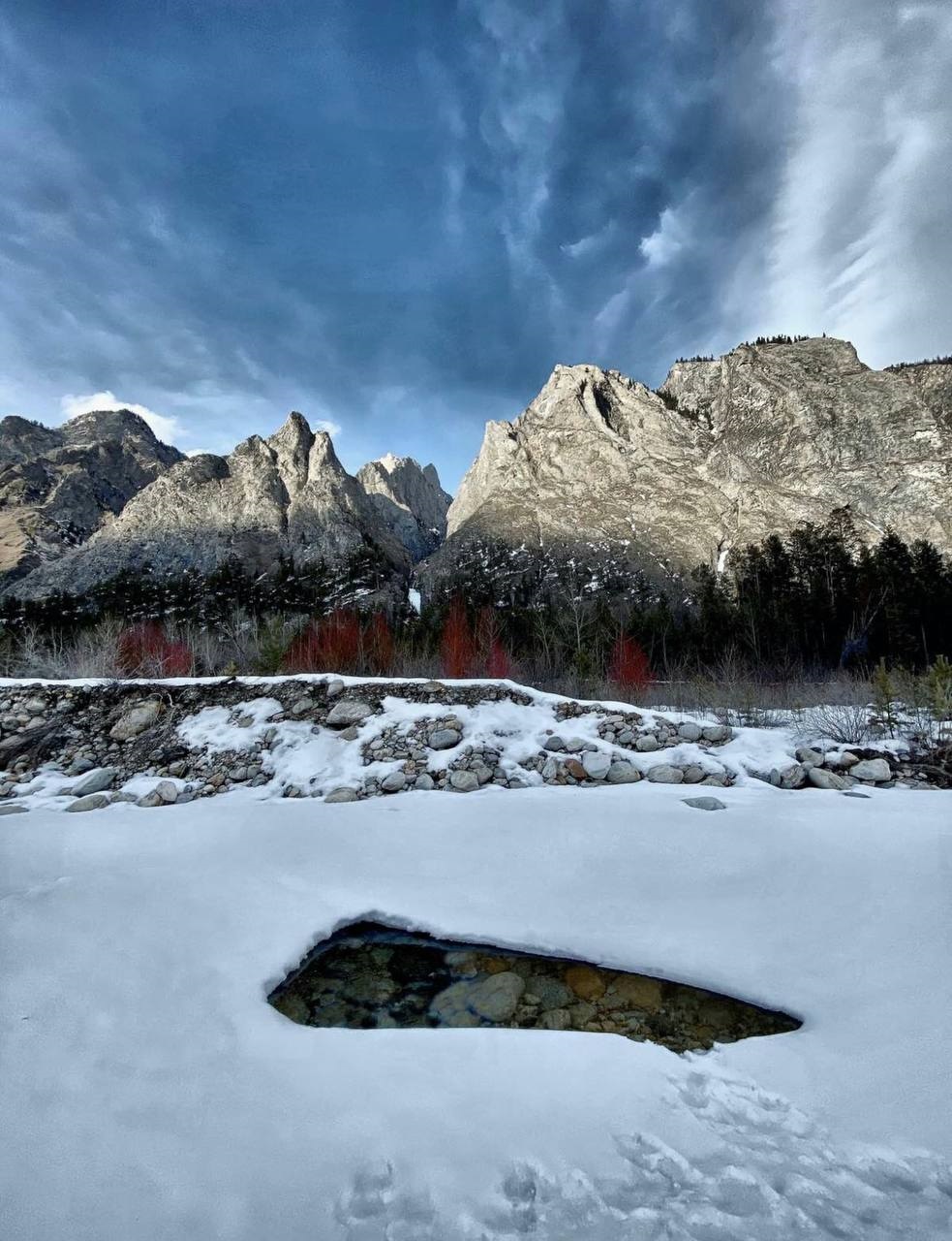 Величественные горы, отвесные скалы, густой богатый лес, причудливо замерзшие